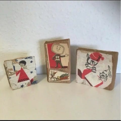 Træstykker Med på limet julemotiver fra papir, bemærk der er på begge sider
