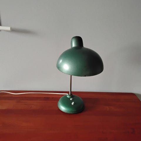 Bordlampe i tysk Bauhaus stil. Minder meget om Christian Dell når vi kigger på særligt skærmens form. Afbryderen (som mans er mangen til i stikkontakter) af bakelit er dog typisk et dansk påhit og også set hos Louis Poulsen. Skærm senere malet hvid. Virker fint. Sender ikke