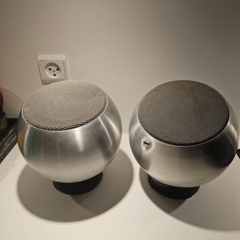 Et sæt Hifi mikro højttalere fra Anthony Gallo Acoustics, model Nucleus. Dia: ca 13cm. Solidt hvidt metalkabinet i meget god stand. Kun enkelte meget beskedne slidmærker.