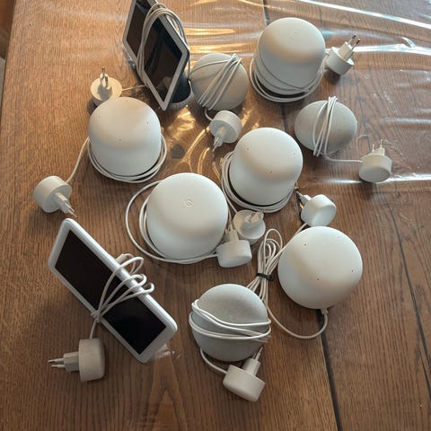 Google Nest Wifi Router i hvid farve samt 1 WiFi punk, seriøst trådløst netværk med moderne design. Velegnet til oprettelse af stabilt Wi-Fi i hjemmet eller kontoret. Kabler medflg. Så det er klar til brug.