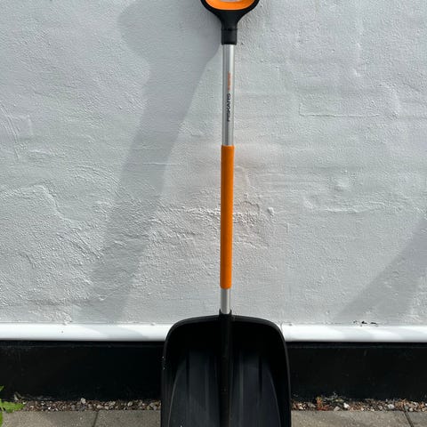 Fiskars skovl til sne med langt skaft i sort og orange farve. Skovlen har en bred, robust blad til effektiv fjernelse af sne. Skaftet er designet til at give godt greb og komfort under brug.