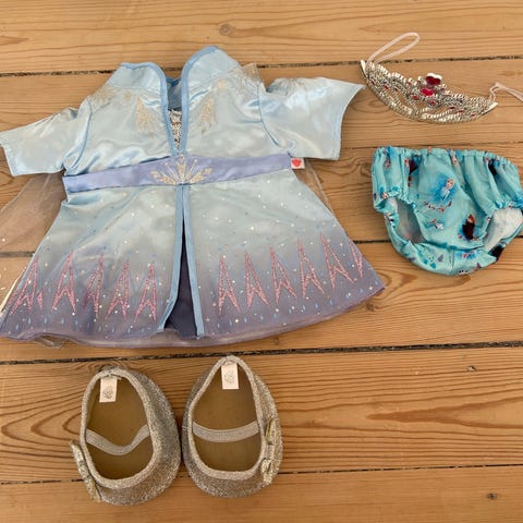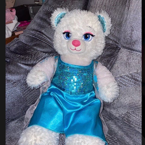 Build-A-Bear Elsa Frozen bamse i blåt plys med detaljer som navn og Disney Frozen-logo på fødderne.