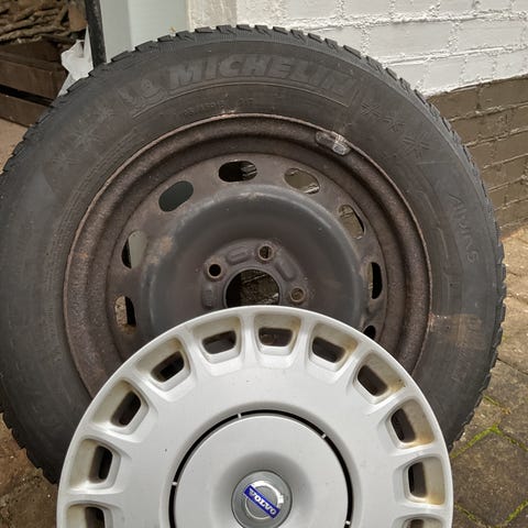 Jeg fik fejlindkøbt disse vinterhjul med gode Michelin lameldæk og TMPS ventiler på Volvo stålfælge, der er 5 boltehuller.