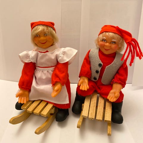 Retro julepynt, 2 små gamle julekirker med rødt tag