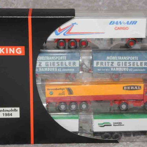 Sættet er brugt men køretøjerne fremstår som nye. Indeholder 1 Ford sættevogn, 1 Mercedes sættevogn, 1 Scania sættevogn og 6 stk. VW T3 kassevogne. Leveres i original æske.