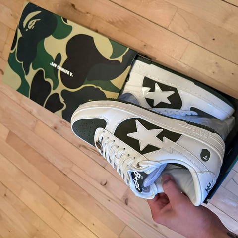 De er brugt 1 gang i kort tid, der er ingen brugsspor og de står som helt nye. Kvittering, boks, ekstra snørebånd og en lille bape pose medfølger.