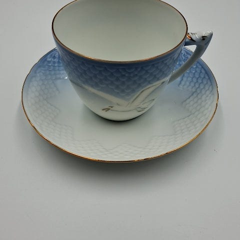 Kaffekopper. Sættet består af en kop, underkop og kagetallerken. De har en hvid baggrund med blå nuancer og detaljer i guld. Materialet er porcelæn med en glat overflade og gyldne kanter.