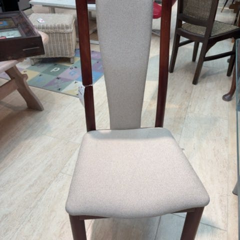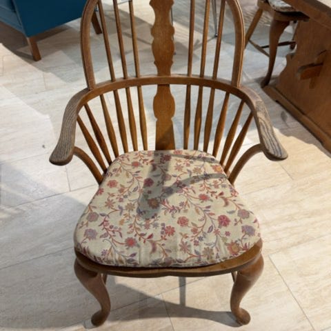 Stolen har en blød, polstret sæde med farverigt mønster. Rammen er lavet af træ og har en elegant, buet ryg.,Afhentes i:,Røde Kors Kolding (621),Bemærk at mail, chat og beskeder ikke besvares, og varen skal købes på knappen "Gå til varen"