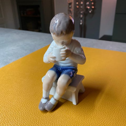 Fin figur, dreng med en hvid T-shirt og blå shorts. Materialet er porcelæn fra Royal Copenhagen.,Afhentes i:,Røde Kors Egå (751),Bemærk at mail, chat og beskeder ikke besvares, og varen skal købes på knappen "Gå til varen"