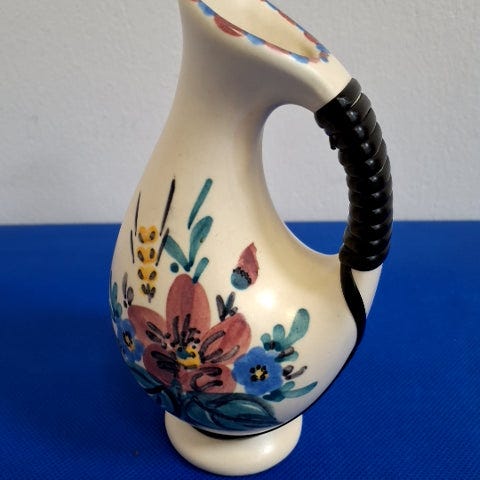 Kanden har en rund form med en dekorativ, buet tud. Den er lavet af keramik med ornamentale motiver i sort.,Afhentes i:,Røde Kors Kolding (621),Bemærk at mail, chat og beskeder ikke besvares, og varen skal købes på knappen "Gå til varen"