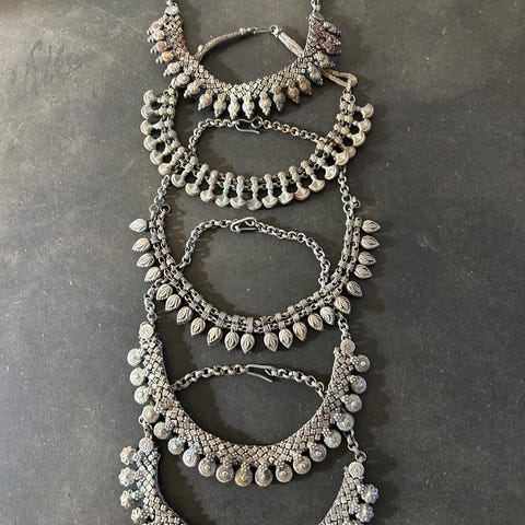 Stort antikt Hmong (Miao) halssmykke fra det sydlige Kina. Det er forsølvet metal og i pæn stand med let patina. Er fra start 1900 tallet og sjældent på vores breddegrader. Smukt både som ekstraordinært smykke til særlige lejligheder eller vægudsmykning.