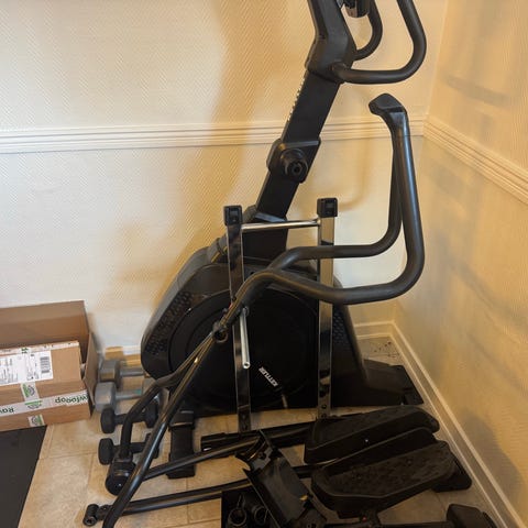 Træningsudstyr til hjemmet med digitalt display og justerbar modstand. Designet til at give en effektiv kardiovaskulær træning. Robust konstruktion med fodpedaler og håndtag til både over- og underkropstræning.