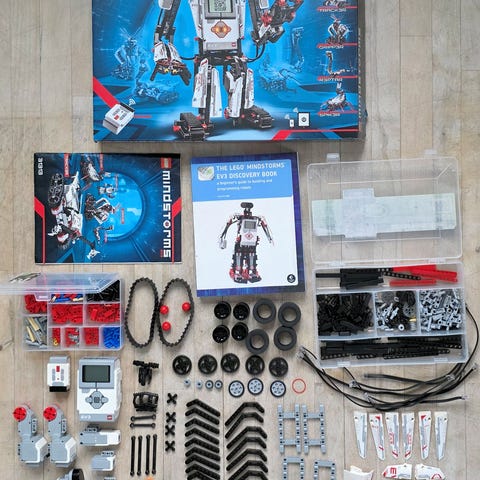 LEGO Mindstorms EV3 robotbyggekit med diverse tekniske dele, herunder motorer, sensorer, styringsenhed med skærm, kabler og mange små byggekomponenter i plastik. Sættet er designet til at bygge og programmere robotter og indeholder dele til mekaniske konstruktioner og elektronik.