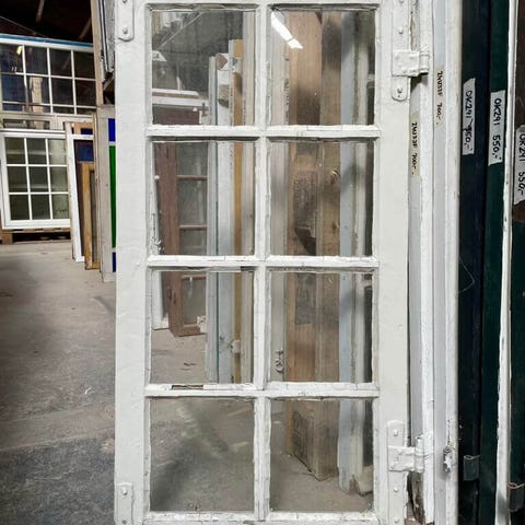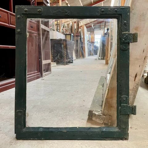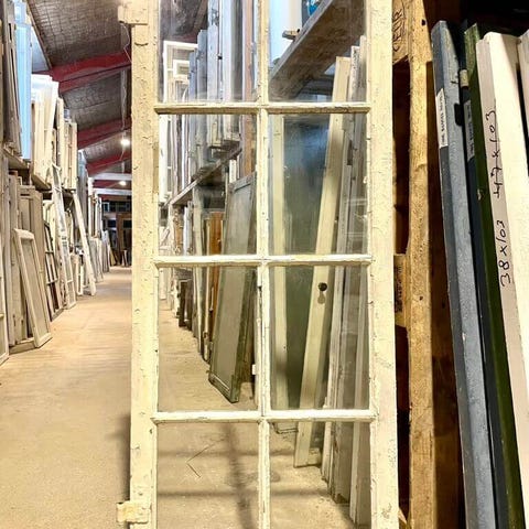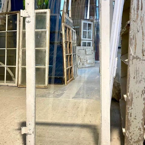Original, klassisk og smal vinduesramme i kernetræ. Med én stor rude i originalt, blæst glas med smukt lysspil. Træværk overordnet sundt. Maling let afskallende samt stedvis løs/manglende kit. Pæne hjørnebånd, der hæfter fint.