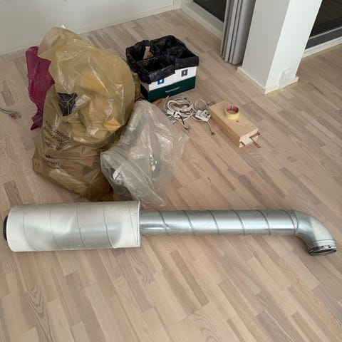 300 meter Industrielle ventilationsrør (spirorør) med mange tilslutninger og tilbehør i metal gives væk. Rørene er designet til luftcirkulation og ventilation i større rum eller fabrikshaller.