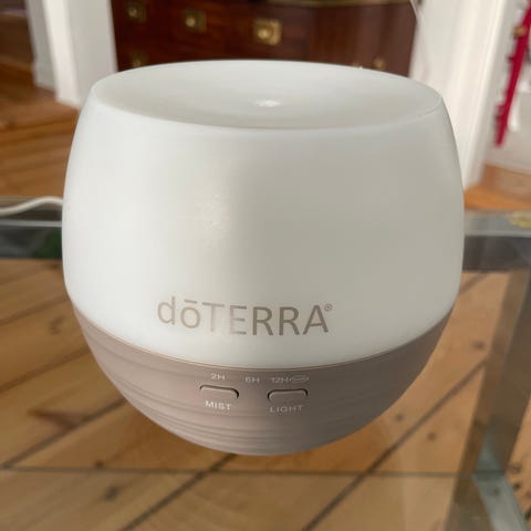 Flot olie diffuser fra Doterra. Brugt men virker upåklageligt- spreder duften dejligt og har en indbygget lampe (kan slukkes) med flot skær.