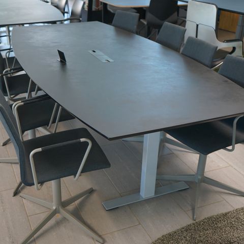 Elegant og funktionelt mødebord fra Kinnarps i grå finish med runde søjleben.