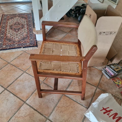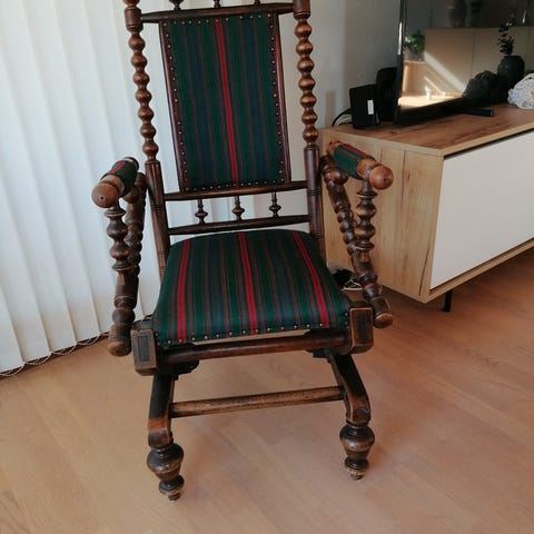Træstol med polstret sæde og buet rygstøtte. Stolen har et klassisk design med snoede ben og brun polstring. Velegnet til spisebord eller som ekstra siddeplads.