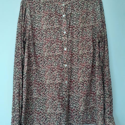 Materialet er en lækker, lidt tung viskose, som falder rigtig flot. Løs pasform. Lukkes med perlemorsknapper. Skjorten er transparent i de kryds, der er i stoffet.
