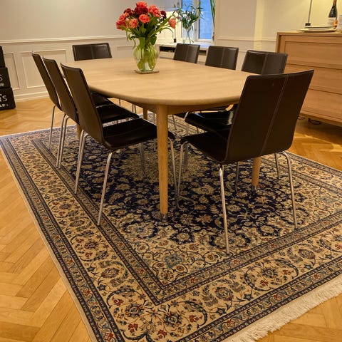 Smukt håndknyttet persisk tæppe fra Nain-regionen i Iran. Et tæppe af høj kvalitet. Klassisk medaljon-design med fine detaljer og silkeindslag, som giver ekstra glans og elegance.