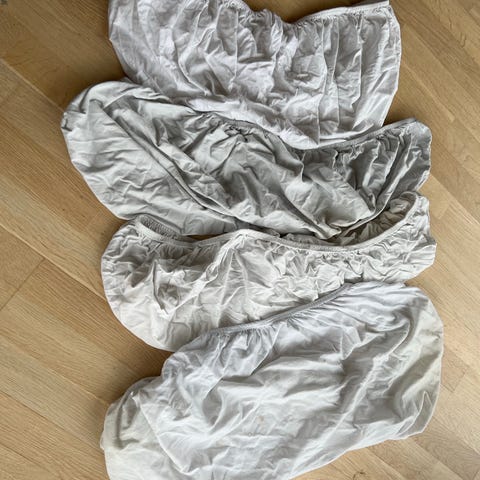 3 lagner til lift (den ene lidt lyseblå) og 1 lagen til barnevogn plus 1 vådliggerlagen til barnevogn.