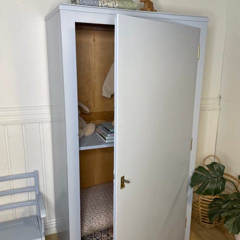 Skabet mangler stadig et ekstra lag maling på ben og underside samt indvendigt omkring bøjlestangen, da billederne er taget 🥛🍪