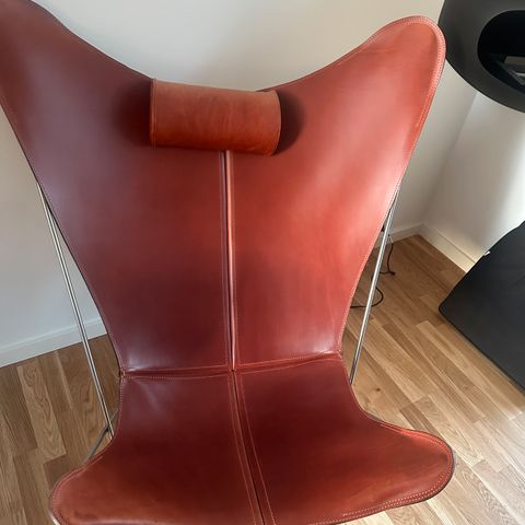 Very cool bat chair in black leather. Real sheepskin is also available for 100 kr in addition.