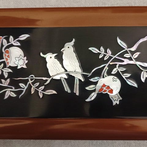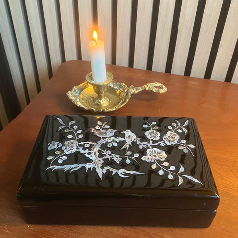 Meget flot 6 kantet smykkeskrin i udsmykket perlemor. Har en diameter på 16 cm og en højde på 6 cm.Fløjslignende rødt materiale indvendigt og grønt i bunden. Lidt brugsmærker begge steder ( se billeder)