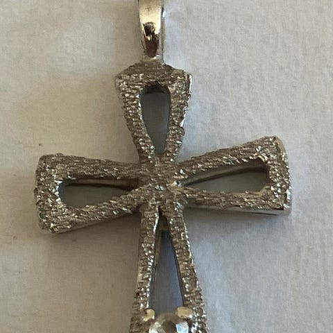 Antikt kors vedhæng fremstillet i sølv med en perle i midten. Vedhænget har en unisex-design, der kan bæres af både mænd og kvinder. Materialerne omfatter sølv og perler, hvilket giver et klassisk og tidløst udseende. Er 6 cm x 4 cm