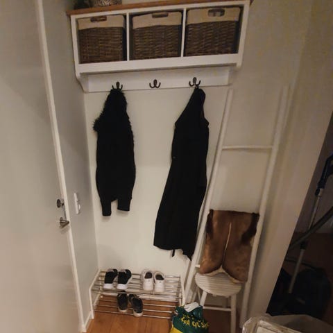 Casa hattehylde og knagerække i sortbejset eg sælges samlet.