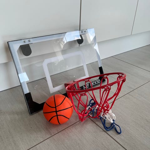 Udendørs basketballbane med justerbar højde, sort stel og gennemsigtig backboard. Basen kan fyldes for stabilitet. Velegnet til udendørs brug i private haver eller rekreative områder. Selve kurven er bøjet, grundet den væltede i en storm så skal nok udskiftes