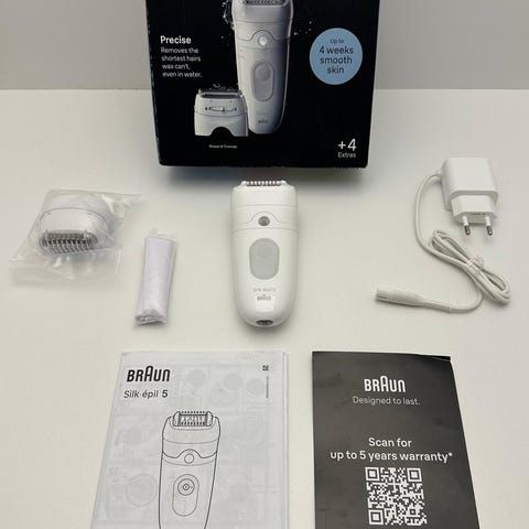 ubrugt Braun Silk-épil 5 epilator i hvid farve. Denne epilator er designet til at fjerne selv de korteste hår og kan bruges i vand. Den kommer med to ekstra tilbehør og er ideel til at opnå glat hud i op til fire uger.