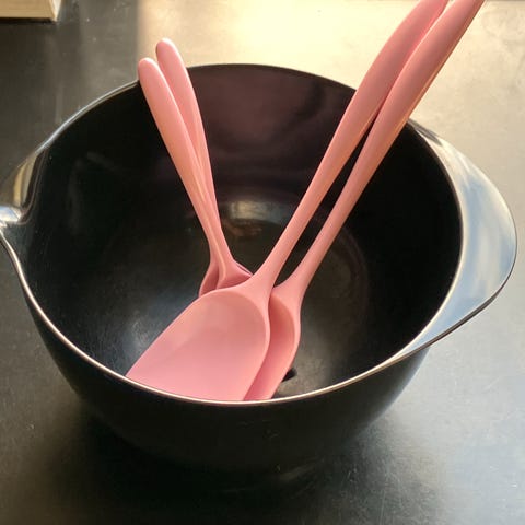 1-1.25 liter rører skål i melamine fra Rosti H 16 cm dia.10’cm og 3 træ bestik i hårdttræ ca 30 cm lange nyt/ubrugt. Kan sendes