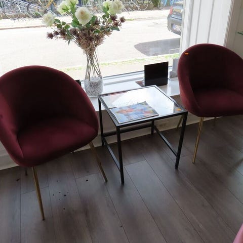 Smukt stole sæt i velour med guld ben, med smukt hvidt rundbord