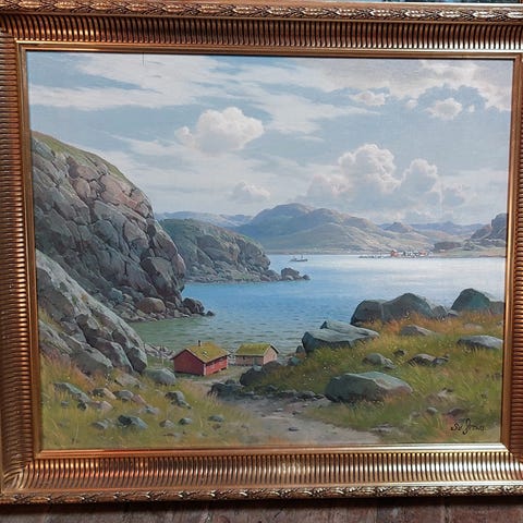 Farvetonerne domineres af blå, grå og gule nuancer. Signatur ses på bagsiden af lærredet.