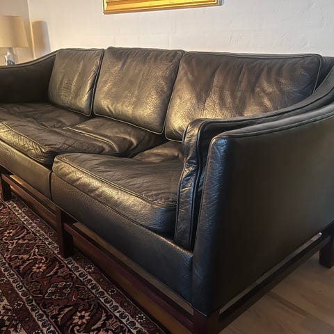 Klassisk dansk sofagruppe i sort læder med stel i mahogni. 3-personers sofa, en 2-personers sofa samt en lænestol. Design af Georg Thams for Grant Møbelfabrik A/S.