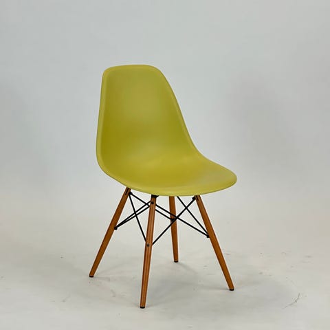 Flot og velholdt original Eames DSW spisestol af glasfiber i farven “parchment white” (råhvid) med nyere stel i valnøddetræ med grå filt-dutter. Glasfiberen har en let og jævn patina, men ingen knæk eller krakkeleringer. Et flot eksemplar af denne designklassiker.