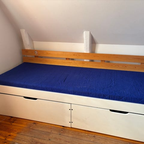 Briks - kan trækkes ud til liggemål 140 cm. Rullemadras 140 cm medfølger.