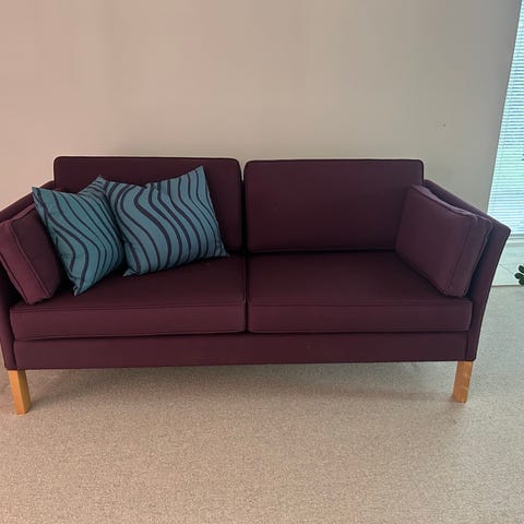 Fin sofa i grå/brun uld. Lidt slid på to hynder - men de kan evt. vendes.