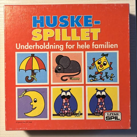 Play Sallys far Huskelspillet brætspil med kort til hukommelsesspil. Spillet indeholder forskellige kort med illustrationer, der skal matches. Egnet til børn og familier, designet til at træne hukommelse og opmærksomhed.