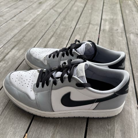 Nike Air Jordan 1 Retro High OG basketballsko i størrelse 41 (EU), svarende til US 8 og UK 7. Farverne er sort, hvid og blå. Skoene er designet til basketball og har en høj ankelstøtte. Materialet består af læder med klassisk Nike swoosh logo og Air Jordan vinge-logo på siden.