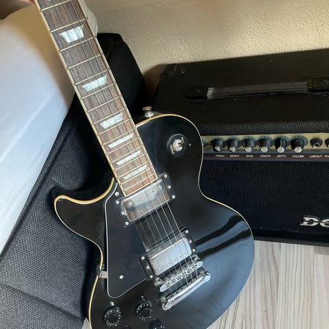 Cruiser Elektrisk Guitar med sort finish. Guitarens krop og hals er i træ med en mørk gribebræt. Udstyret med tre enkeltspolede pickupper, tre kontrolknapper og en tremolo-bro. Designet til elektrisk guitarbrug.