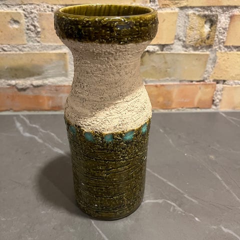 Meget smuk vintage vase formet som en lille kande, til en blomst eller bare som dekoration. Vasen er fra 1960'erne og er lavet i Tyskland. Vasen har en smuk grøn drypglasering med rød og hvid detaljer.
