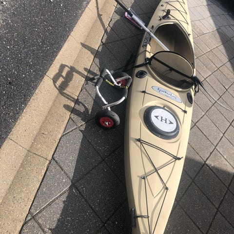 Hobie Mirage Outback kajak med pedaldrev, udstyret til fiskeri. Kajakken er beige og har et komfortabelt sæde med polstring. Den har integrerede fiskestangholdere, et ekkolod monteret foran, samt et robust pedaldrevssystem med finner. Kajakken er designet til en person og egnet til fiskeri og rekreativ brug på vandet.