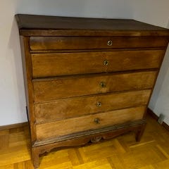 Fin, gammel kommode med 3 skuffer og nøgle, som virker til alle 3 skuffer. Snoede ben. Bud modtages.