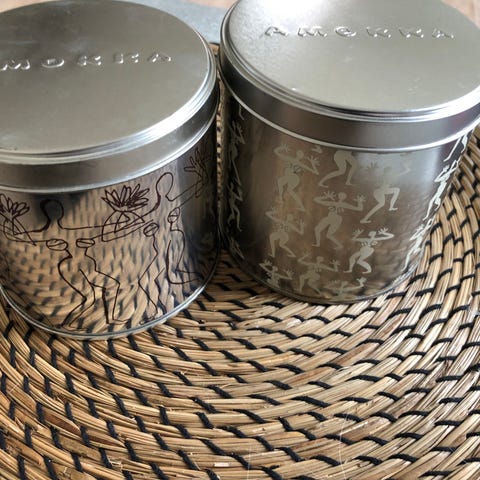 Metaldåse til kaffe med " Amokka" trykt i låget. Den er flittigt brugt og har et par mindre buler og lidt ridser. Men pynter stadig på en hylde. - Den er sølvfarvet og har rødbrune stregtegninger.