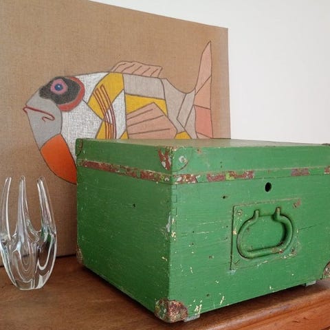 Længste måler H: 8 x 36 x 10 cm og minder om gammel kasse til lysbilleder