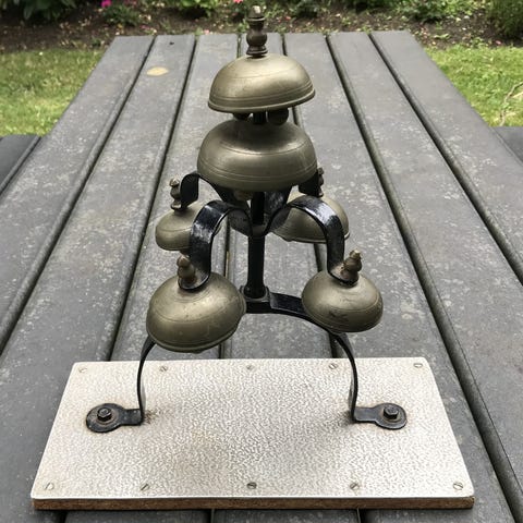Flot ringeklokke til fx forretning. Støbejern med bemalet hest (lidt rustpletter på hesten). Kneblen er også støbejern og klokken har en flot, kraftig lyd. Det øverste øje til ophæng er knækket af, men klokken kan hænges op på anden vis. Der er er hul til skrue nederst i ophænget. Kan sendes mod betaling af porto.