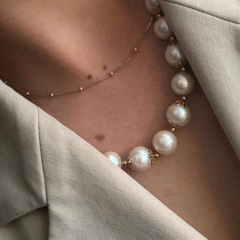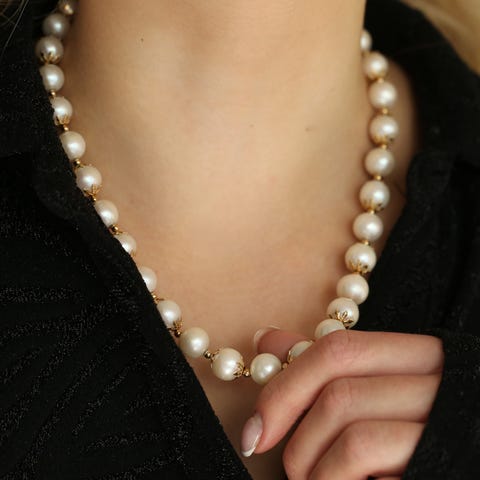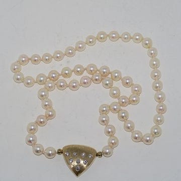 Perlehalskæde i 14K guld med blomstermotiv og diamant (0.03