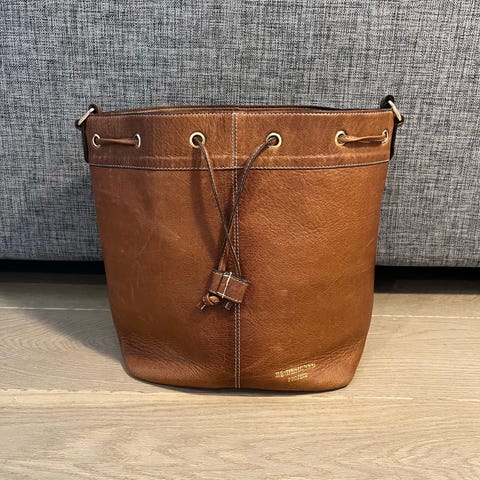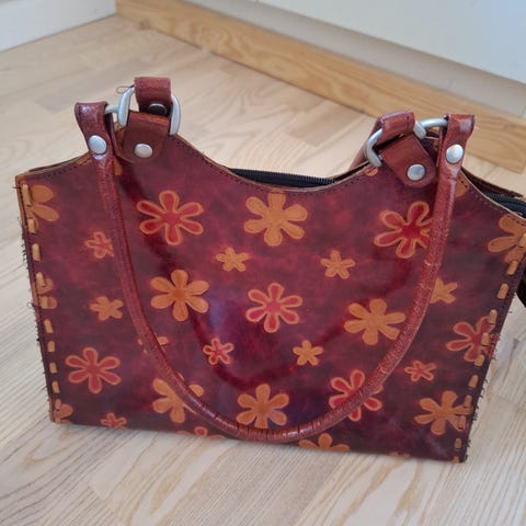 Unik taske syet i læder i forskellige farver. Der er en lomme på “bagsiden” godt skjult og med lynlås. Når man løfter “klappe” er der et stort rum med lynlås, og et ekstra lille også med lynlås, og et foran igen med lynlås. (4 rum/lommer i alt og alle med lynlås. Skulderstroppen har en max længde 122 cm.